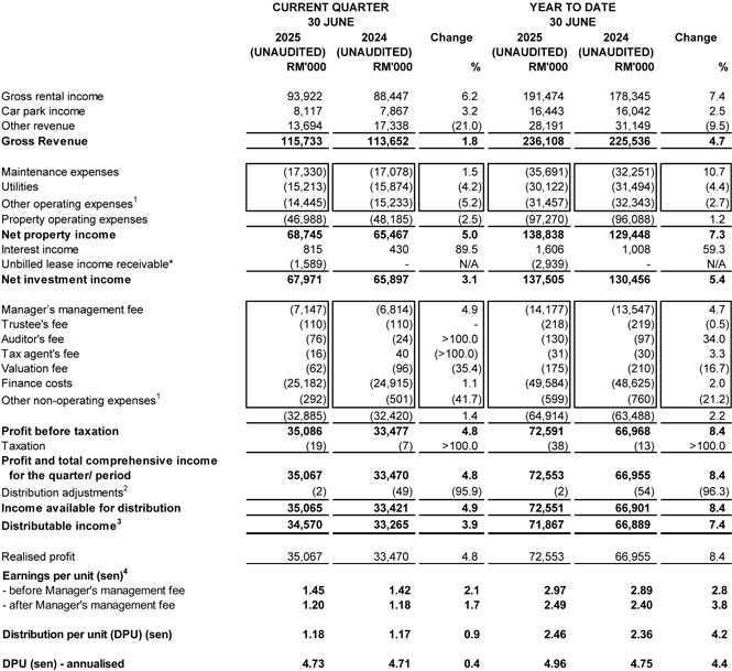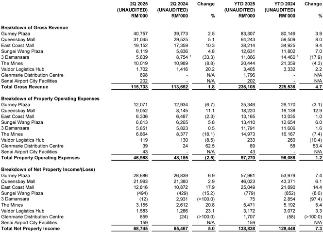 Excluding the effect of the aforementioned RM3.0 million one-off compensation income, net property income for 2Q 2025 of RM68.7 million has effectively increased by 10.0% against 2Q 2024.
